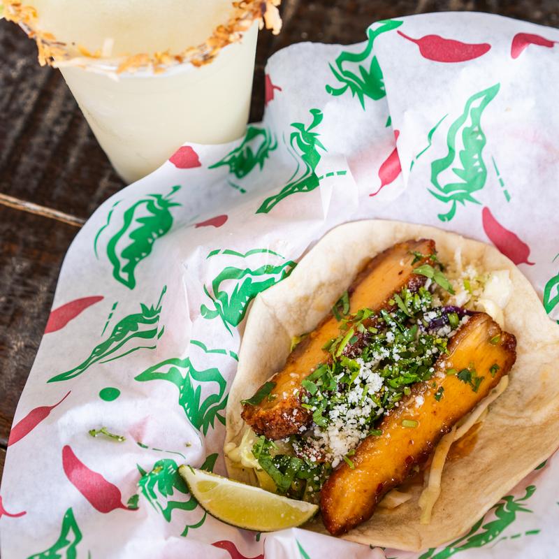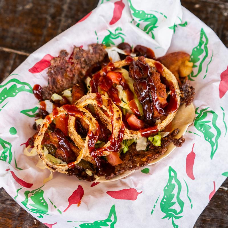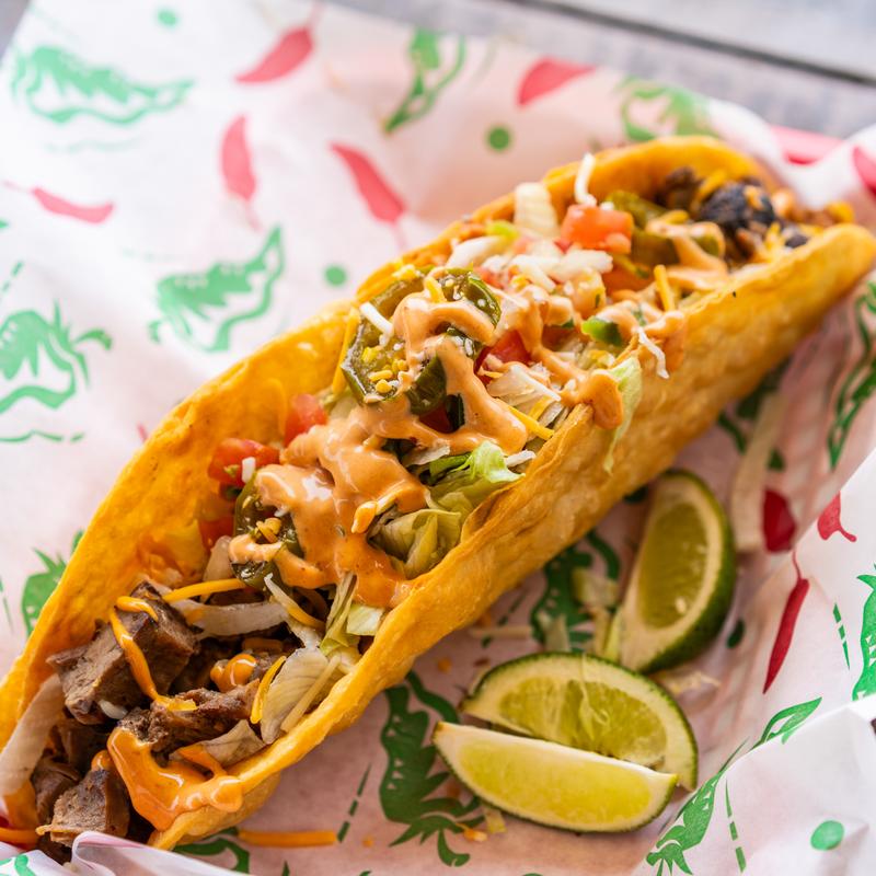 Shredded cheddar, borracha beans, street corn, shredded lettuce pico, cowboy candy with your choice of meat, and a chipotle lime sauce | It's a foot-long taco!