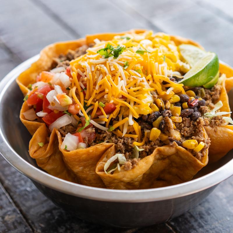 Fresh crunchy flour tortilla bowl, ground beef, black beans, rice, lettuce, pico, and esquites corn.