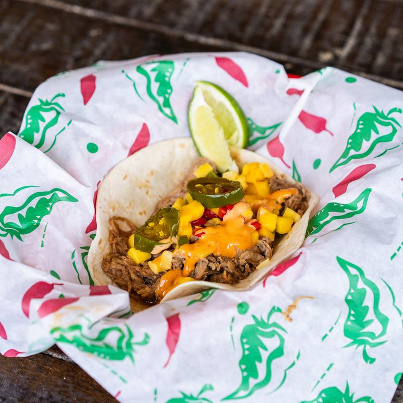Hickory smoked pulled pork, candied jalapenos, mango relish, and a chili lime sauce.